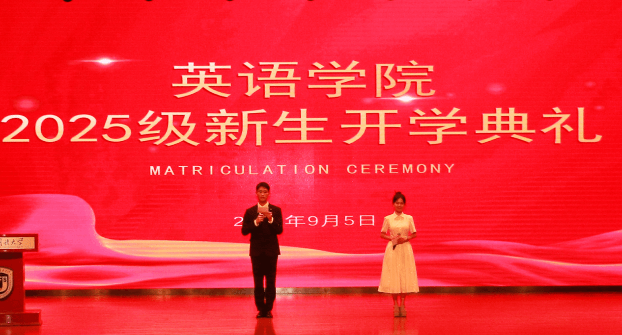 2025年9月5日下午,英语学院2025级新生开学典礼在千人礼堂举行。北京外国语大学原党委书记、现校友会会长杨学义、英语学院党总支书记殷悦、党总支副书记、院长杨鲁新、党总支副书记孟庆琨、组织员王欣扬及各研究中心老师、本科班主任出席本次典礼,学院本硕博及国际项目部800余名新生共同参会。
