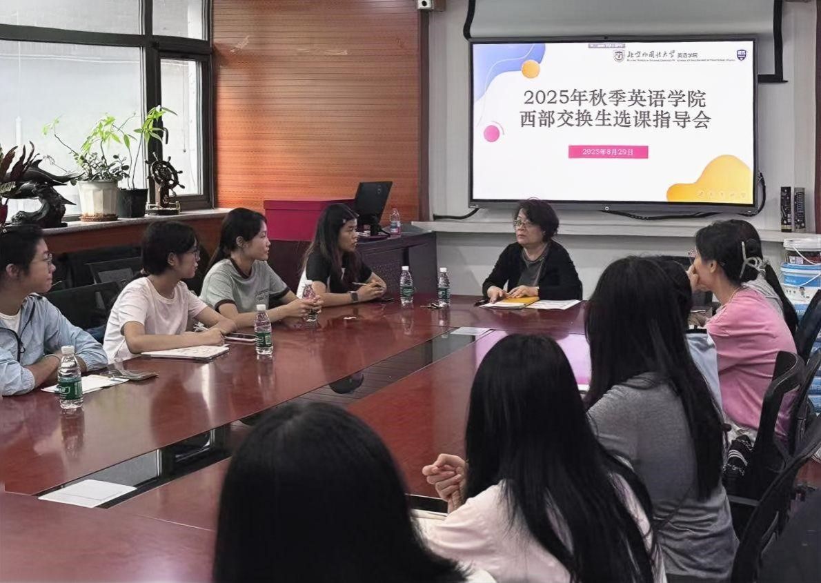 2025年8月29日,在新学期开学之际,英语学院迎来西部对口支援的新疆大学、中国石油大学(北京)克拉玛依校区、西藏民族大学、喀什大学4所高校的14名学生,学院在英语楼115会议室召开西部对口支援学生见面会及选课指导会。英语学院党总支书记殷悦、副院长张莲教授、辅导员王晓楠、教务秘书陈照与王红婴,以及西部对口支援的参会。