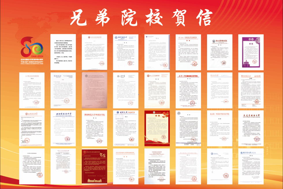 高等学校外语类专业教指委主任委员以及30余所兄弟院校的英语学院或外国语学院发来贺信,为英语学院80华诞送上祝福。