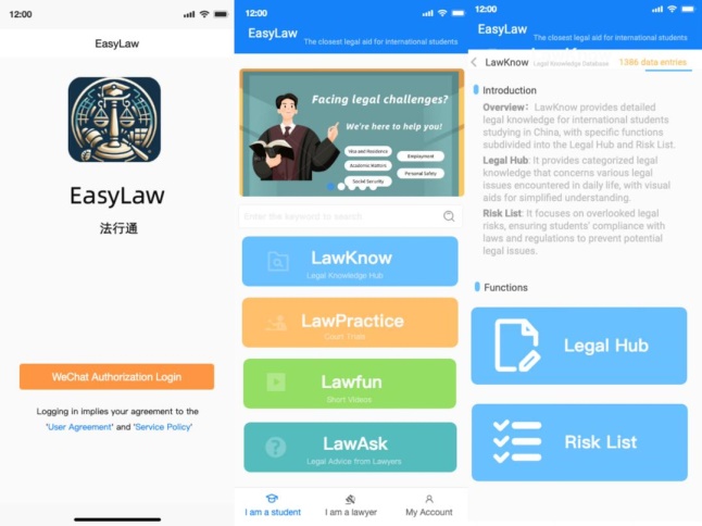 “法行通”APP(EasyLaw),以服务来华留学生为己任,专注于解决国际留学生在中国遇到的法律难题,涵盖签证、就业、学业、社会保障等问题。该平台提供lawKnow(法律信息小站和风险清单提示)、LawFun(寓教于乐的短视频形式)、LawPractice(在线法庭观看服务)、LawAsk(网络法律咨询服务)等四个模块的法律服务,不仅能帮助在华留学生更好地了解并适应中国法律体系,保障自身权益,同时助力中国法律体系“走出去”,是讲好中国法治故事和促进国际教育的生动诠释。