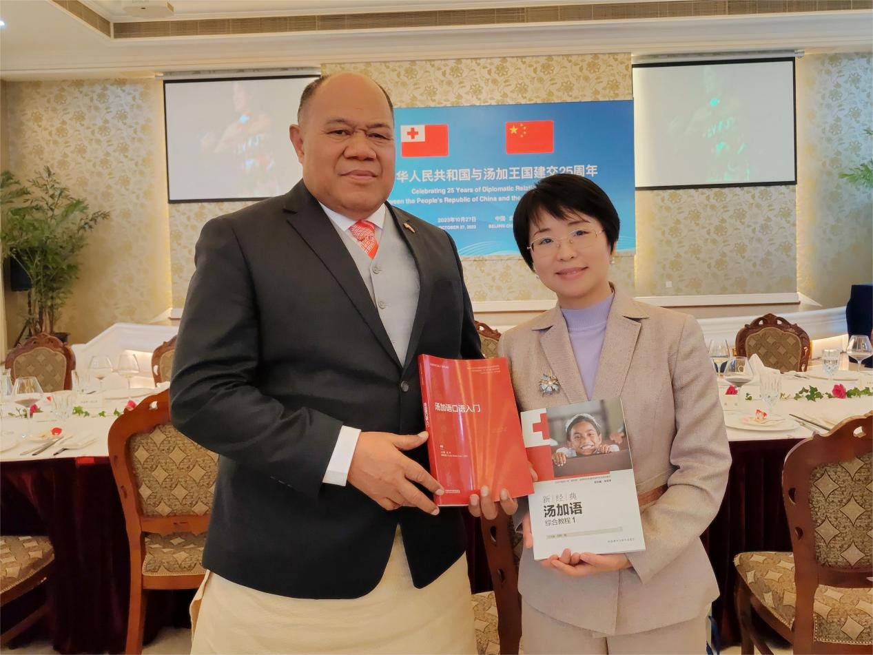 友协副会长姜江、汤加王国驻华大使陶阿伊卡·乌塔阿图在招待会上致辞。英语学院王文丽老师作为高校代表、国内首部汤加语教材编写者受邀出席招待会。王文丽老师向中外嘉宾展示了外研社今年出版的两部汤加语教材--《汤加语口语入门》《新经典汤加语综合教程(一)》,并介绍了英语学院建设八门南太非通语种专业的工作进展。与会嘉宾纷纷表示赞叹和祝贺,汤加大使对两部教材给予了高度认可与赞扬。