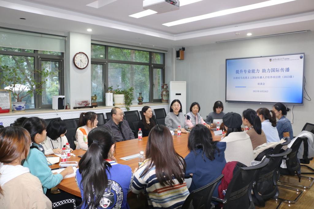 10月20日,英语学院召开了21世纪马克思主义国际传播人才培养项目班(2023级)提升专业能力·助力国际传播主题座谈会。英语学院党总支书记王明欣、副书记孟庆琨,教师代表刘波,教务秘书王红婴、陈照以及2023级北外-人大21世纪马克思主义国际传播人才培养项目班学生代表们参会。座谈会由党总支副书记孟庆琨主持。