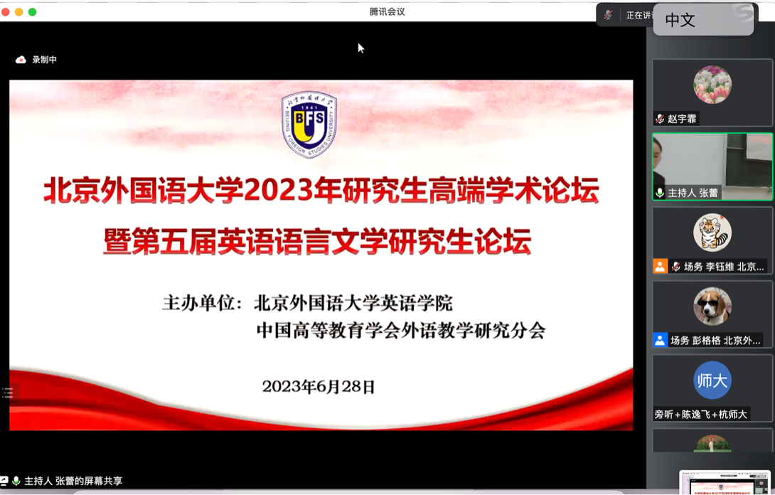 2023年6月28日,北京外国语大学研究生高端学术论坛暨第五届英语语言文学研究生论坛圆满落幕。本次论坛由北京外国语大学英语学院和中国高等教育学会外语教学研究分会联合主办,邀请外语界知名专家现场指导,为国内英语语言文学、语言学与应用语言学、国别与区域研究相关专业的研究生提供了展示最新研究成果、交流学术经验的平台。本次论坛收到来自全国各大高校外语学科的硕士生及博士生投稿近六百篇,论坛活动以线上线下相结合的方式展开。