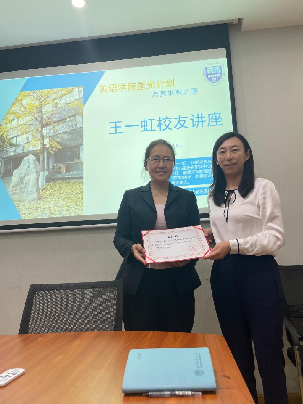 5月10日,北京外国语大学英语学院1986届本科毕业生,现中国儿童语言研究中心副主任,北英测评系统创始人王一虹女士,受邀回到母校,参加“‘星光计划’点亮求职之路”系列沙龙活动。此次活动由英语学院校友发展协会主办、团总支学生会协办。英语学院党总支书记王明欣、校友事务办公室主任王欣扬参加活动。