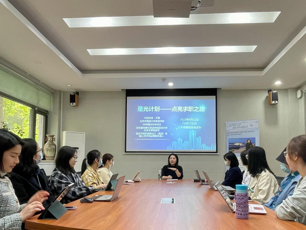 4月22日下午,英语学院举办“星光计划”系列沙龙活动。本次座谈会邀请了2009届校友,现中国机械进出口(集团)有限公司市场运营部负责人王建。王建围绕求职话题,分享了自己的本科学习、职业生涯经历经验,对同学们的学业规划及未来就业提出建议。面对同学们关于实习、就业、英语专业在工作中的用处等的诸多困惑,王建耐心解答,解决了同学们“如何在工作中使用英语这门工具”,“英专生如何适应职场变化”等方面的疑惑。