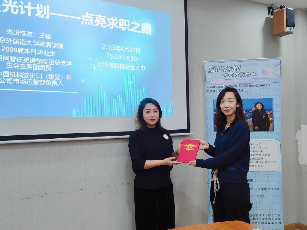 活动结束后,英语学院校友事务办公室主任王欣扬代表学院向王建校友颁发英语学院“星光计划”学生成长导师聘书。