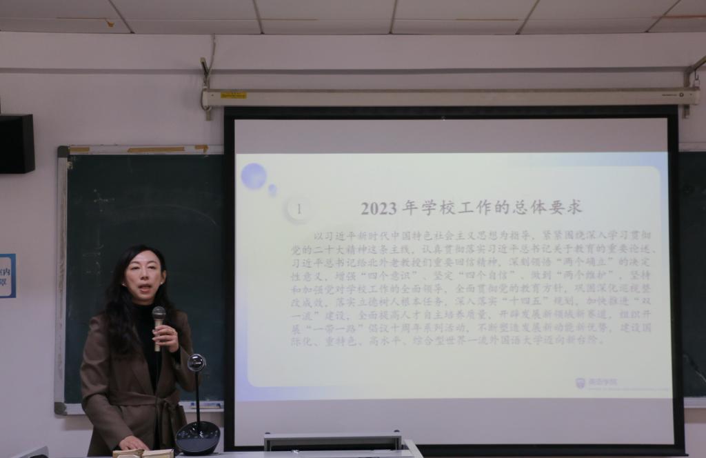 党总支书记王明欣就学院党建和思政工作进行了全面部署。她通报了2023年学校工作的总体要求,结合英语学院实际,从五个方面提出学院党建工作的重点和目标。一是要突出政治建设,不断强化思想引领。把学习贯彻党的二十大精神与学习贯彻习近平总书记给北外老教授重要回信精神结合起来,推进党的二十大精神进课堂进头脑,培养更多“三有”人才。二是要突出制度建设,严格落实主体责任。持续推动学院科学决策,全面筑牢意识形态“防火墙”。三是要强化党组织自身建设,继续推进教师党员队伍建设,对标对标创先争优。四是要落实立德树人根本要求,构建协同育人格局及五大育人体系。五是要推进学院文化建设,培育暖心聚爱的学院文化。