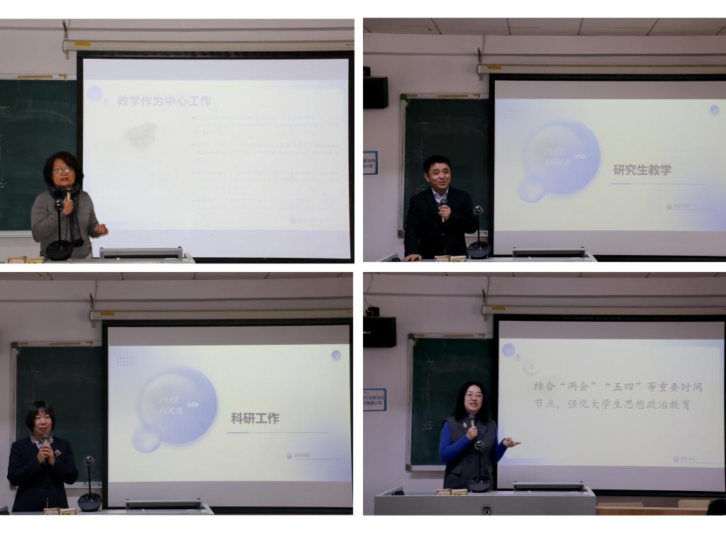 副院长张莲介绍了本科生课程开设及师资建设情况,并指出要在确保教学、管理、辅导、考试等日常工作顺利开展的基础上,着重做好国家一流本科专业建设、虚拟教研室建设、北外-人大21世纪马克思主义国际传播项目班建设、教学立项、常态化辅导以及教务管理等工作。副院长王展鹏从研究生招生宣传、导师制建设、课程思政、论文答辩以及育人模式等方面,提出要“扎根中国大地、对标世界一流”,全面提高研究生人才培养质量。副院长彭萍就新学期科研工作和对外合作工作进行了介绍。她鼓励教师积极申报国社科、教育部等各级各类科研项目。提出要规范各类讲座、研讨会、学术沙龙的申报、审批、管理和检查工作。在对外合作中,要做好师生出国出境交流学习的安全保障工作,不断推进2023年高端引智以及与国外大学合作项目。党总支副书记孟庆琨汇报了本学期学生工作的重点。一是结合“两会”“五四”等重要时间节点,加强大学生思政教育。二是全力做好2023届毕业生就业保障工作。三是积极开展心理问题及困难学生帮扶工作。四是依托英语文化节,不断丰富创新校园文化活动。