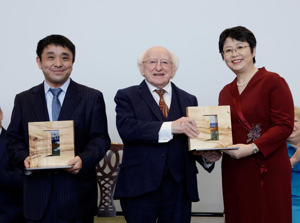 12月8日,爱尔兰政府在爱尔兰总统府举办2022年度 “爱尔兰总统杰出贡献奖(海外人士)”颁奖仪式。爱尔兰总统迈克尔·希金斯出席仪式,发表演奖,并向获奖者颁奖。我校英语学院爱尔兰研究中心主任王展鹏教授、副主任陈丽教授在“企业与教育”类别下获奖。该奖项首次颁发给我国学者,旨在表彰他们为加深中国人民对“爱尔兰文学、文化的兴趣做出的杰出贡献”, “特别是通过建立北京外国语大学爱尔兰研究中心产生的深远影响”。2022年共有来自阿富汗、美国、南非、英国等国的12位各界人士获奖。爱尔兰总理米歇尔·马丁,外交部长西蒙·科文尼等参加相关活动。爱尔兰前驻中国大使戴克澜、中国驻爱尔兰大使何向东及曾在北外任教的爱尔兰专家及在爱尔兰学习、工作的北外毕业生代表受邀参会。