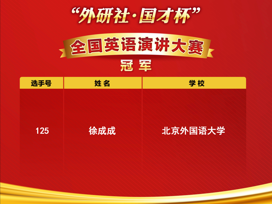 第四阶段赛题以“The Grand Course”为题眼,“大道之行,天下为公”,9位选手与孔子跨越时空对话,以青年人的独特视角,探索古代中国智慧带来的新知、新觉与新变,探索中华优秀传统文化的精神内涵与当代价值。徐成成同学以“Leadership”为关键词展开探讨,引经据典,凭借丰富的知识储备、多元的文化视角、开阔的思维视野,阐释了中国共产党在建设新中国、实现人民共同富裕方面发挥的关键领导作用,畅谈构建人类命运共同体的美好愿景。最终,荣获全国决赛总冠军,充分彰显了当代中国青年的刚健自信、锐气担当。