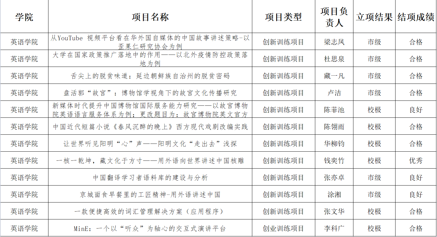 根据《关于2022年大学生创新创业训练计划项目结项工作的通知》,学校开展结项验收工作,学院提前组织结项答辩评审委员会,对2022年度大创项目进行预审,经过材料评审、项目陈述、答辩、修改等环节后提交学校审核,2021年英语学院大学生创新创业训练计划共计12个项目结项,其中1个项目获评为优秀项目、3个项目获评为良好项目。