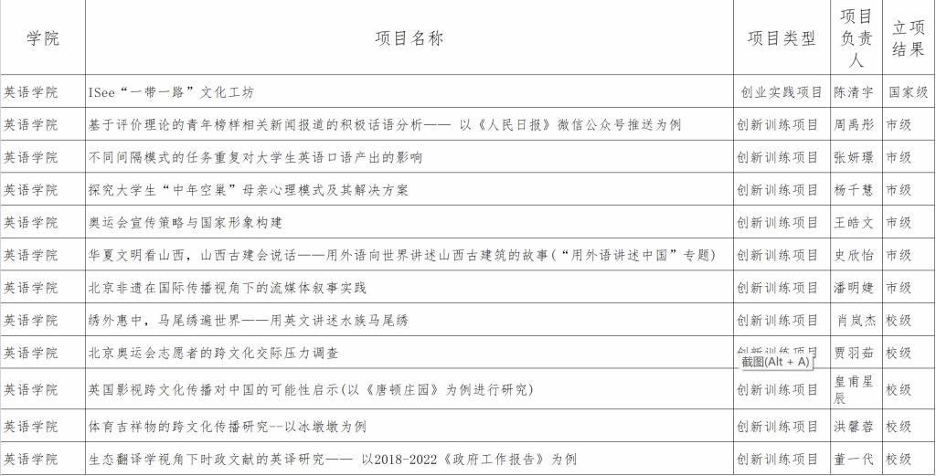 2022年英语学院英语学院高度重视“大学生创新创业训练计划”项目,坚持教学与实践相结合,教育创新与社会创新相结合的原则,强化我院学生创新创业能力训练,提升我院学生的创新、协作意识和实践能力,并期待同学们能将项目中收获到的经验和学习成果运用到今后的工作岗位中去。
