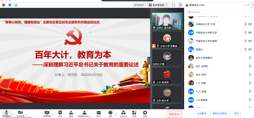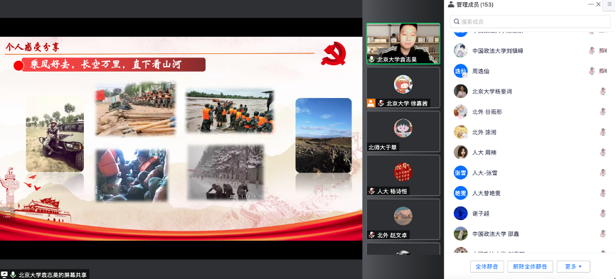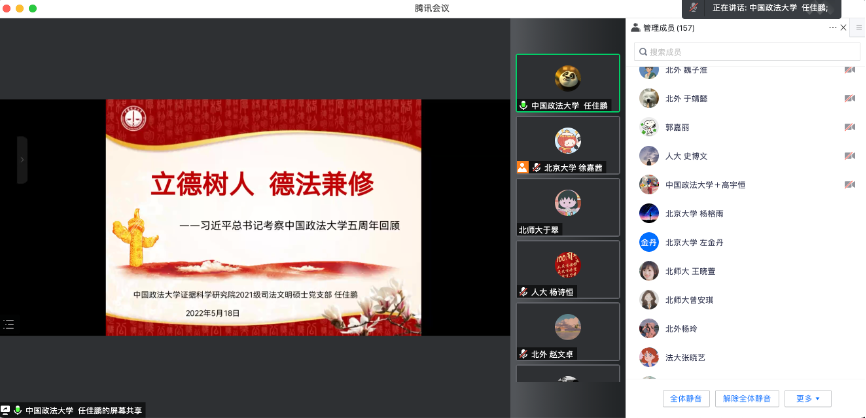 在当前疫情防控形势严峻的情况下,为持续推进英院学子理论学习走深走实。5月18日晚19点,北京外国语大学英语学院本科生党支部与北京大学2021级法律硕士(非法学)第四党支部、中国人民大学法学院2021级法律硕士二支部、北京师范大学法学院2021级法硕第二党支部、中国政法大学证据科学研究院2021级司法文明硕士党支部联合开展“青春心向党,强国有担当”主题党日活动。