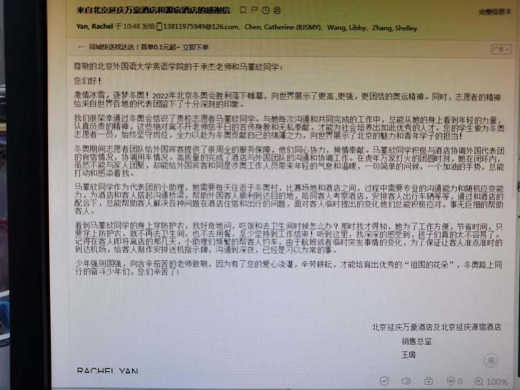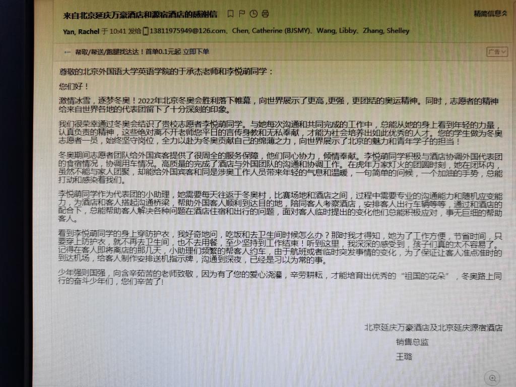 来信指出,2022年北京冬奥会胜利落下帷幕,向世界展示了更高 ,更强,更团结的奥运精神。志愿者的精神给来自世界各地的代表团留下了十分深刻的印象。英语学院的李悦萌、马蓁欣同学,作为志愿者的一份子,她们始终坚守岗位,给外国宾客提供了很周全的服务保障,全力以赴为冬奥贡献自己的绵薄之力,向世界展示了北京的魅力和青年学子的担当!
