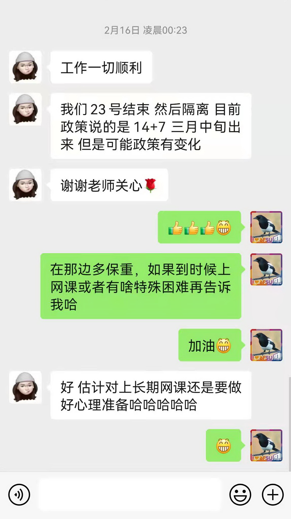 除了提供学业指导,英语学院还以多种形式为学生送去关心和温暖。虎年春节来临之际,英语学院院长张剑、党总支书记王明欣专门录制了慰问视频,鼓励同学们不畏辛苦、磨炼意志,发挥专业优势,服务国家,展示北外学子风采。