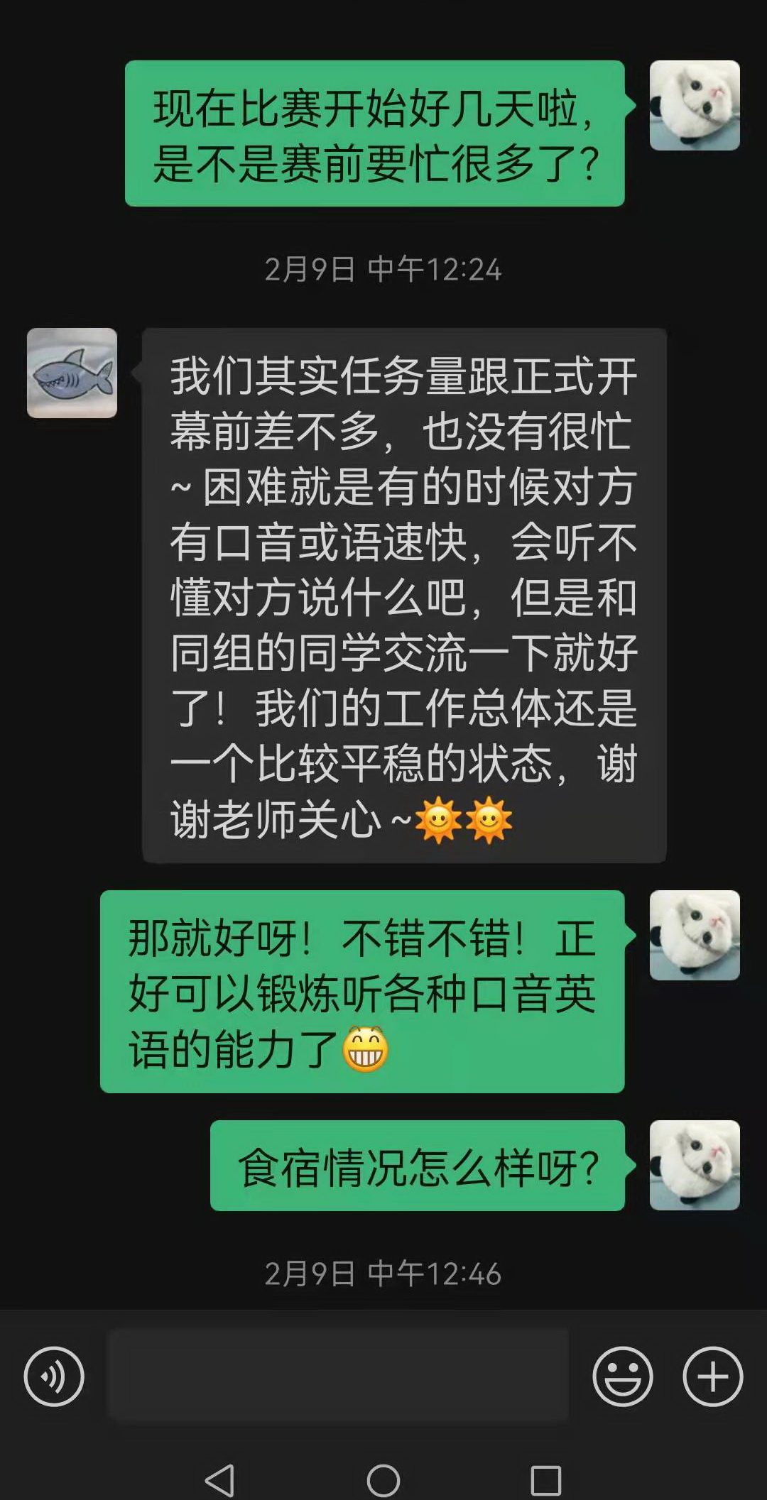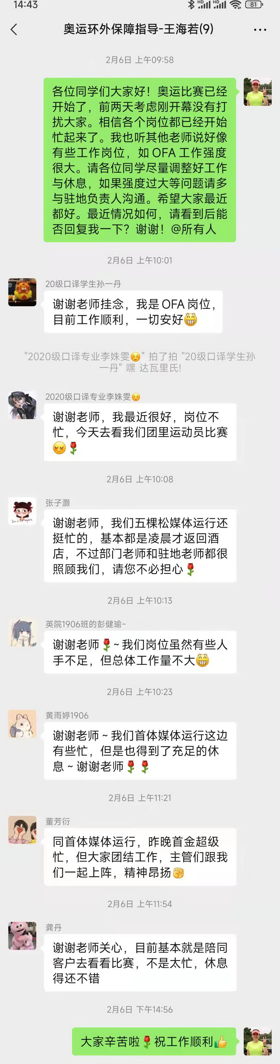 英语学院高度重视此项工作,将冬奥志愿服务工作作为落实总书记重要回信精神的具体举措,抓实抓好。为确保志愿者全身心投入工作,专门组建了由46名专业教师和辅导员组成的环外教师指导团队为学生志愿者提供心理和学业支持。闭环外指导教师与学生志愿者建立沟通疏导机制,帮助学生及时排解因闭环生活、赛事服务、隔离期间学习等方面出现的各种压力与困难。寒假期间,他们牺牲休息时间,每天通过微信聊天、电话沟通等方式关心学生的生活学习情况,为学生送去关怀、解答学生疑惑、协调学生困难。每周汇总学生情况,撰写工作报告。