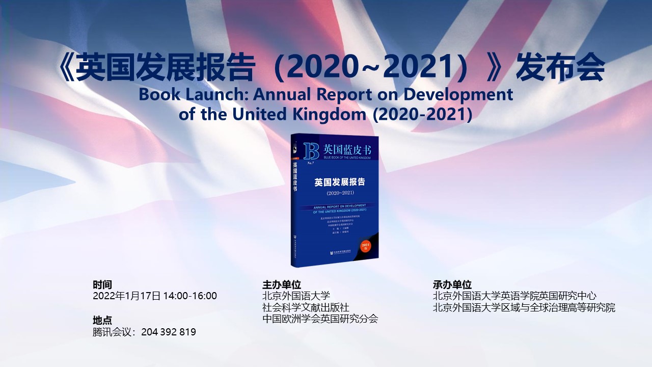 1月17日,《英国发展报告(2020-2021)》发布会线上举行。此次发布会由北京外国语大学、社会科学文献出版社、中国欧洲学会英国研究分会主办,北外英语学院英国研究中心、区域与全球治理高等研究院承办。开幕式由英语学院副院长、区域与全球治理高等研究院副院长王展鹏主持。