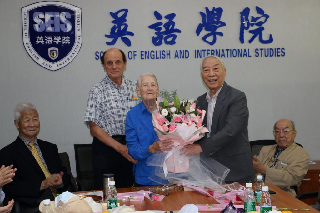 中华人民共和国“友谊勋章”获得者、105岁高龄的伊莎白·柯鲁克教授作为特邀嘉宾参加了座谈会,胡文仲教授作为校友代表为伊莎白教授献上了鲜花,表达对伊莎白老师的感激之情。英语学院院长张剑对校友们的到来表示热烈欢迎,并向校友们介绍了英语学院近年来的发展,特别是学院在学科建设、教学、科研、人才培养等方面取得的成就。张剑院长感谢校友们对学院发展的关心与支持,学院多年来始终初心不改、砥砺前行,未来将继往开来、再谱佳篇。