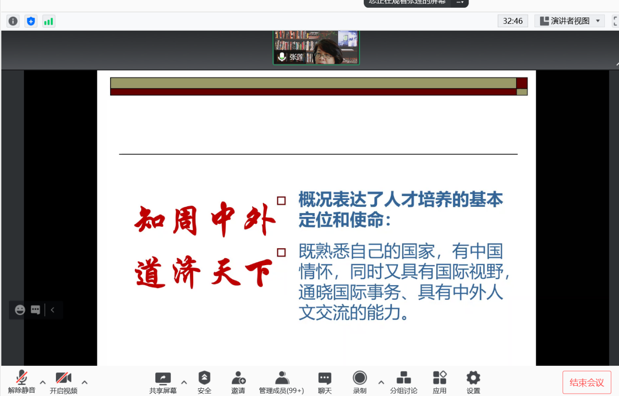 9月8日下午13:00,英语学院2021级本科生新生培养方案介绍会在线上举行,英语学院副院长张莲教授、教务老师王红婴老师以及陈照老师出席了本次会议,会议由辅导员吕籽奕老师主持。介绍会从人才定位、培养使命、课程设置、学习任务、课堂理解以及未来规划等方面详细展开。