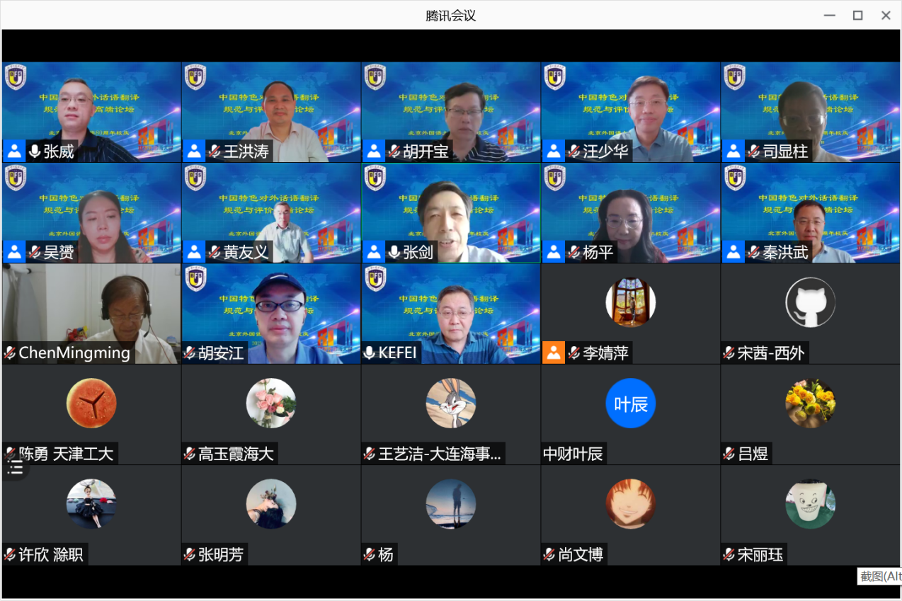 2021年7月24日,北京外国语大学英语学院迎校庆 80 周年系列学术活动“中国特色对外话语翻译规范与评价高端论坛”举行,近300人线上参与论坛。此次论坛为中国特色对外话语翻译系列高端论坛第二次会议,首次会议以大型语料库建设为主题,于2020年11月21日顺利召开。该系列会议依托2019年国家社科基金重大项目“中国特色对外话语体系在英语世界的译介与传播研究(1949-2019)” (19ZDA338)开展,是项目扎实稳进的驱动力,也是阶段性成果汇报与交流的重要平台。