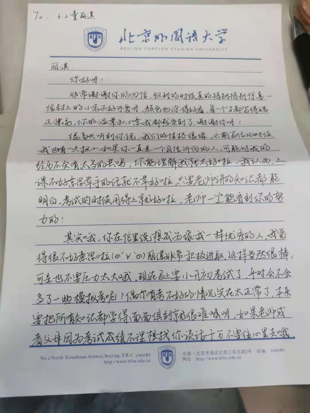 英语学院本科生低年级党支部积极分子何蓉同志表示,自己非常开心能通过这次的活动认识可爱的丽淇小朋友。收到回信的时候真的很感动,因为没有想到一个六年级的孩子可以写出这样满满都是真诚的信,甚至还自己画了可爱的小信封,还能看到橡皮擦的痕迹,可以想象花了多少心思。希望丽淇小朋友可以快乐地长大,做最好的自己。