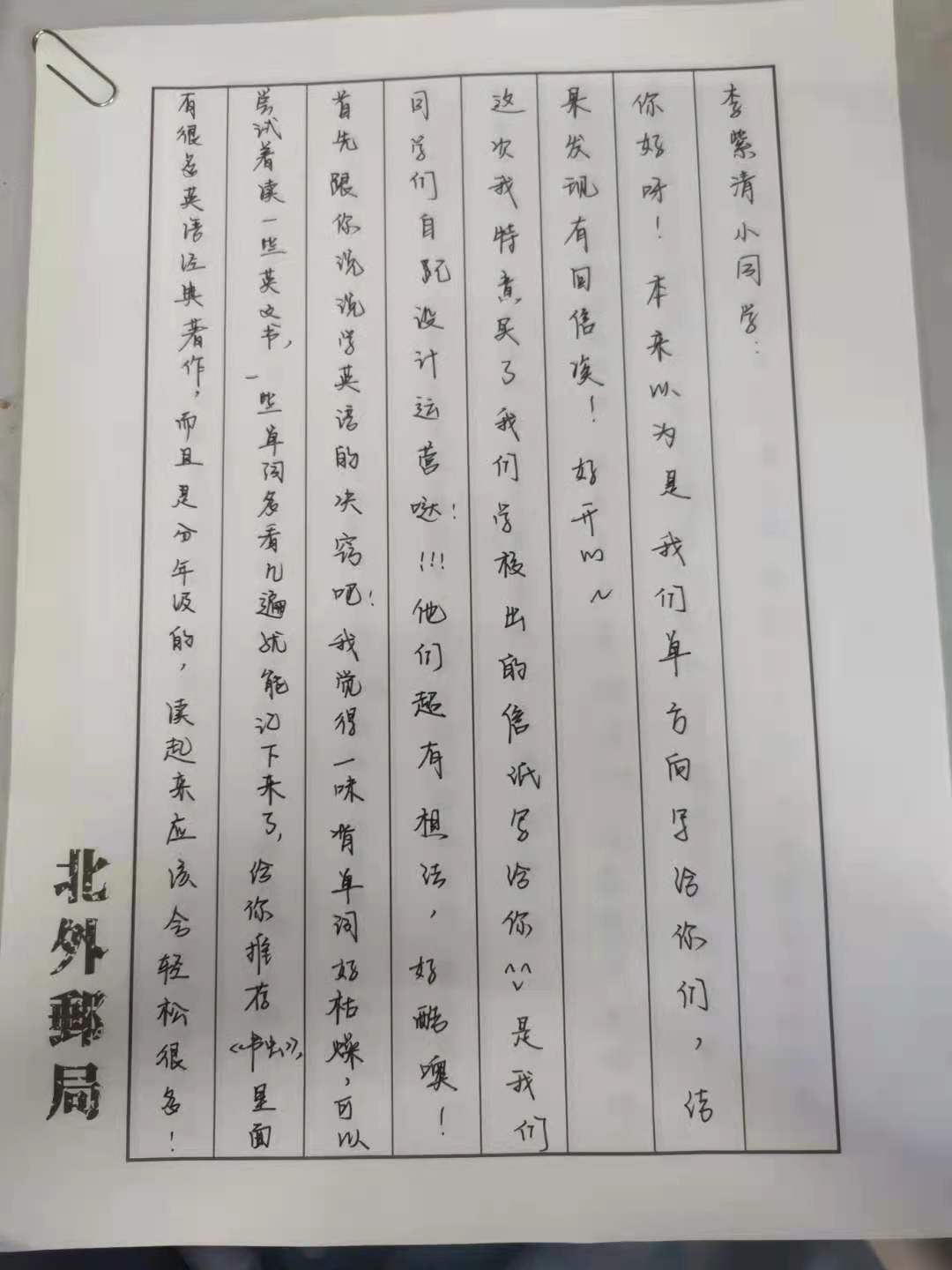 英语学院本科生低年级党支部党员于靖懿同志表示,两次给小朋友写信的活动我都有参与,感触颇深。这是第一次试图以一个大姐姐的口吻和小朋友交流。在写第一封信、选第一本书的时候,我特意上网寻找了五六年级的女孩会喜欢的话题,努力回想自己在这个年龄时的心态,对这两位女孩写下了真诚的问候和建议。当看到回信里对我的祝福的时候,我特别感动。我们虽然身隔几千公里,但因为这些纸上的文字而联系到了一起,一笔一墨能看到最真挚的感情。很感谢党支部的这次活动,让我和素未谋面的女孩有了联络,建立了深厚的友谊。