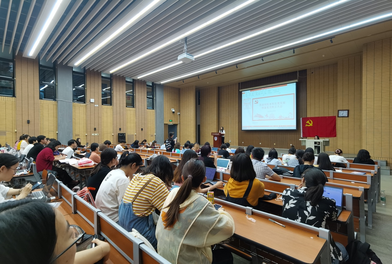 2021年6月9日晚7点30分,英语学院本科生低年级、高年级党支部在逸夫楼三阶教室召开预备党员转正大会。本次大会由本科生高年级党支部书记孙琳同志主持。本科生低年级、高年级党支部89名正式党员、预备党员出席本次会议。