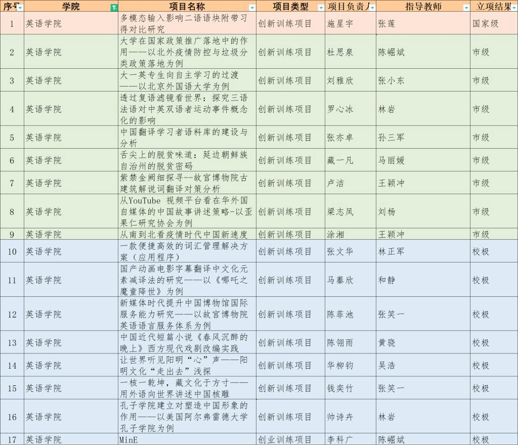 2021年“国家级、市级、校极大学生创新创业训练计划”全校立项评审工作已经结束。学校教务处共收到立项申请107项,经过评审,确定立项97项,其中国家级项目15项,市级项目34项,校级项目48项。其中学院共有17个项目确定立项,其中国家级项目1项,市级项目8项,校级项目8项,具体结果如下: