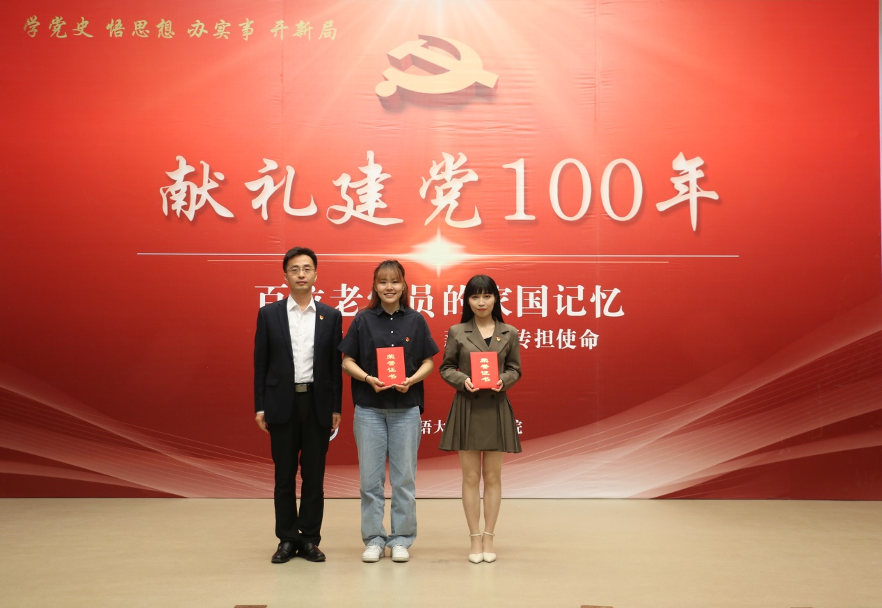 校党委副书记苏大鹏同志在致辞中表示,在喜迎中国共产党百年华诞之际,英语学院党总支提前谋划,精心安排,以“学史鉴往守初心,薪火相传担使命。”为主线,组织学生党员和入党积极分子开展的“献礼建党100年:百位老党员的家国记忆”采访活动很有意义。广大学生党员和入党积极分子通过采访身边的老党员,进一步了解党史知识,坚定理想信念,学习前辈事迹,践行初心使命。厚厚的文稿,承载着百位老党员、百名大学生,新老两代人共同勾画出的一幅幅中国共产党百年蓬勃发展的历史画卷。苏大鹏指出,历史是最好的老师,中国共产党的历史,就是一部中华民族从站起来,到富起来,再到强起来的抗争史、奋斗史、创新史,是指引我们在新的时代背景下,继往开来,大踏步前进的不竭动力。作为国家的栋梁、民族的未来,我们年轻的大学生党员要重视党史学习,从过往中汲取智慧,讲好中国故事,传播好中国声音,真正成为“熟悉党和国家方针政策、了解我国国情、具有全球视野、熟练运用外语、通晓国际规则、精通国际谈判的专业人才”,为推动我国参与全球治理和人类命运共同体建设,做出应有的贡献。苏大鹏还勉励大家要在“国之大者”中找准成就人生的“大格局”,要在党史教育中找到传承红色基因的“大先生”,要与新时代同向同行、共同前进,立大志、明大德、成大才、担大任。