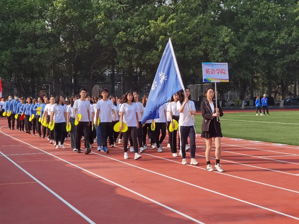 上午8点,阳光明媚,音乐激昂,运动会在欢呼声中拉开帷幕。仪仗队队员手持国旗、校旗以及八十校庆旗帜,迈着铿锵有力的步伐率先入场,各学院师生职工方队紧随其后。英语学院学子自信洋溢,精神抖擞,高喊“八十华诞,辛勤耕耘;英院学子,奋勇争先”的口号,高举爱心状的五星红旗,面带灿烂微笑,散发青春气息。