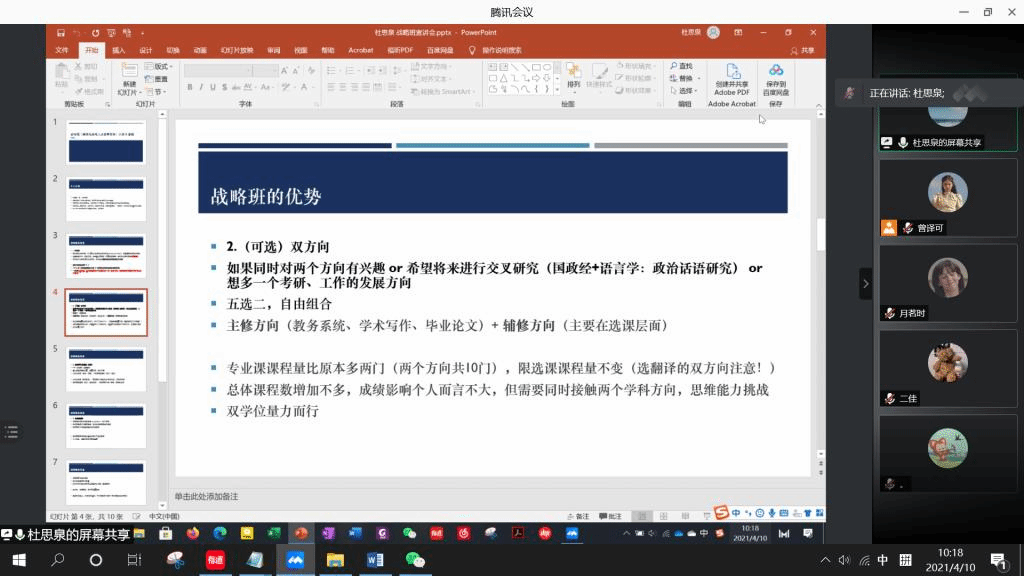 4月10日上午,英学职“战略班介绍”沙龙成功举办。本次沙龙的主讲人是英语学院2019级本科生、战略班成员杜思泉和涂湘。