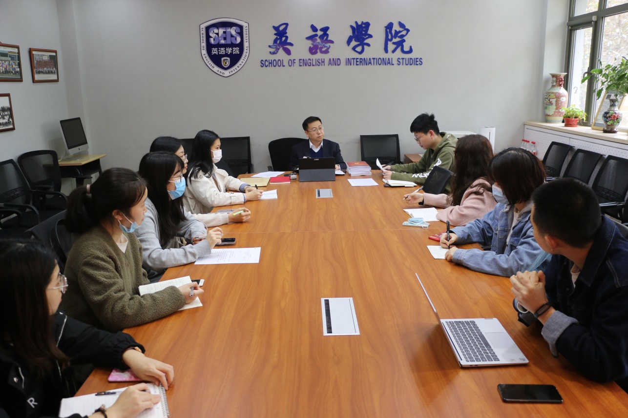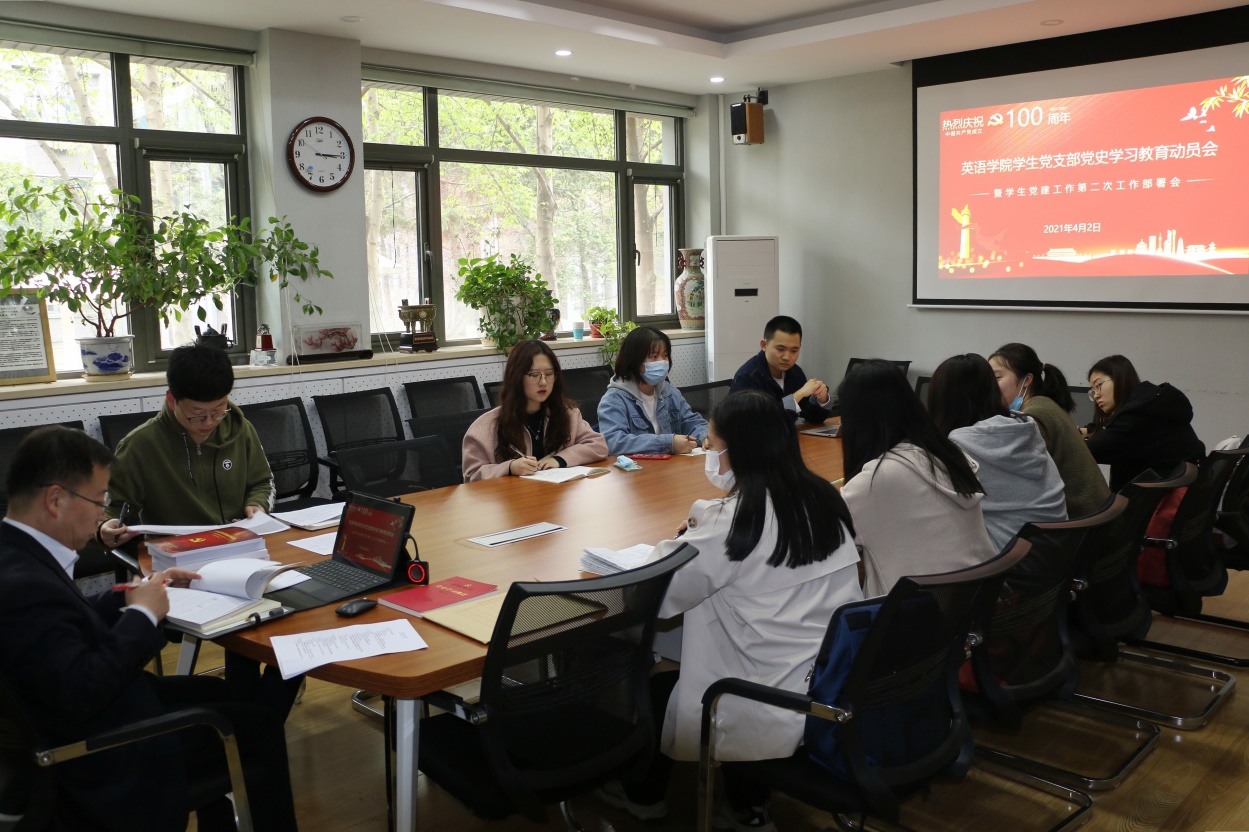 2021年4月2日下午,英语学院党总支在111会议室召开学生党支部党史学习教育动员会暨本学期学生党建第二次工作部署会。党总支书记路兴主持本次会议,辅导员宗辰及各学生党支部书记参加会议。