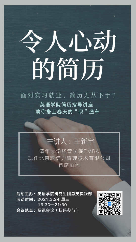 为提高学生简历撰写能力,提升毕业生就业竞争力,英语学院于2021年3月24日晚举办“令人心动的简历”至简历撰写培训讲座。活动邀请到北京职信力管理技术有限公司首席顾问、人力资源领域著名培训师王新宇老师,王老师结合其丰富的面试及就业指导的经历,与同学们分享了简历撰写和面试求职过程中的经验与技巧。