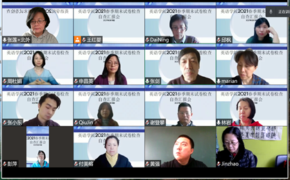 为落实校教务处关于抽查2020-2021学年秋季学期期末考试试卷通知,规范期末考试试卷管理工作,英语学院于2021年3月18日召开2020-2021学年秋季学期期末考试试卷自查汇报线上会议。院长张剑、副院长张莲、彭萍、英语系副主任张小东,以及本科各教研室主任、方向负责人及课型组长、教务秘书参加了此次会议。