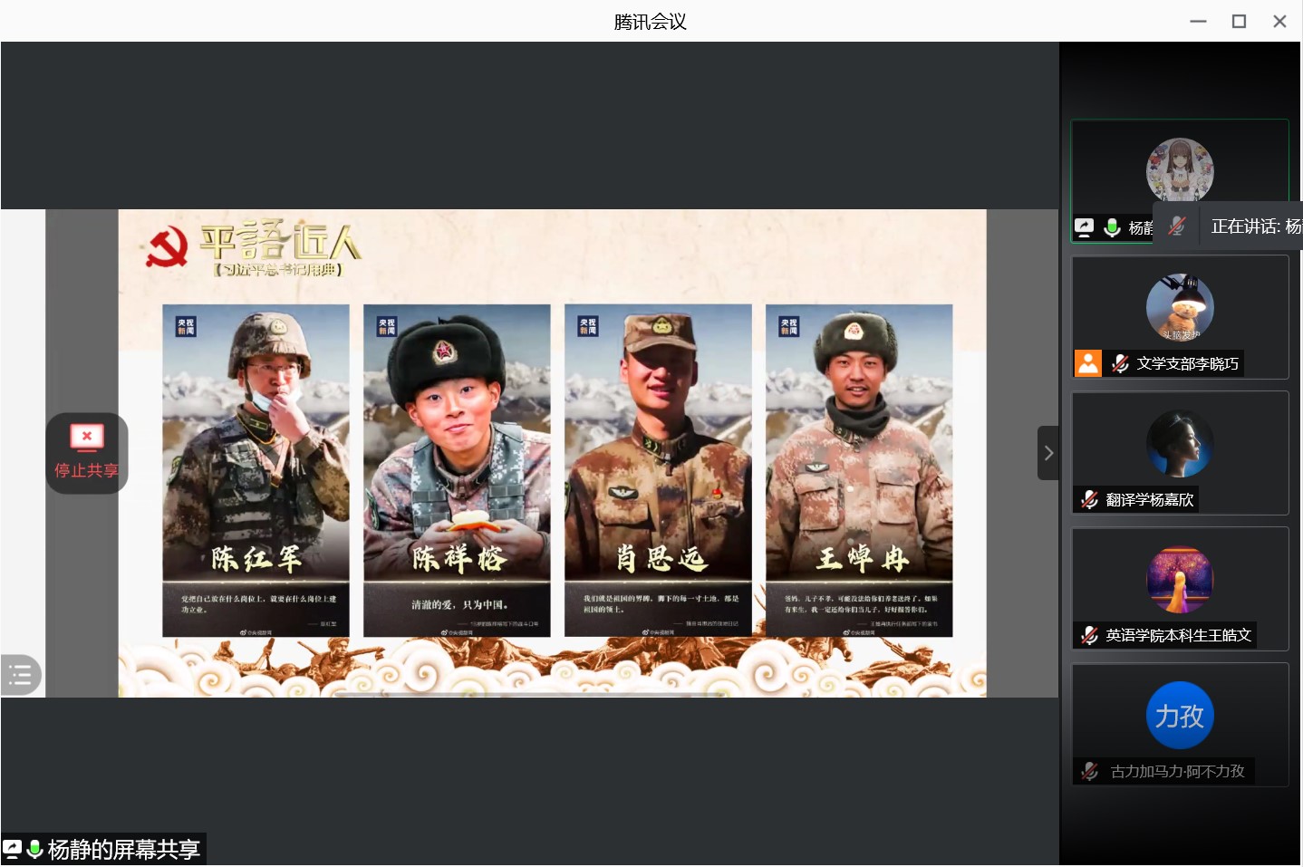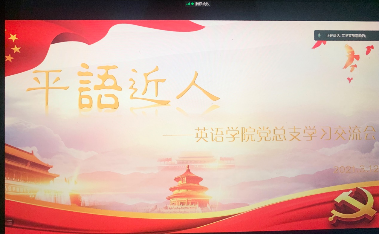 2021年3月12日,英语学院党总支组织各学生党支部开展了《平“语”近人——习近平总书记用典》第二季的学习交流会。来自英语学院本科生支部、研究生语言学支部、研究生文学支部、研究生翻译学支部、研究生MTI笔译支部、研究生MTI口译支部、研究生国别研究(一)支部、研究生国别研究(二)支部的25名同志参与了本次学习交流活动。