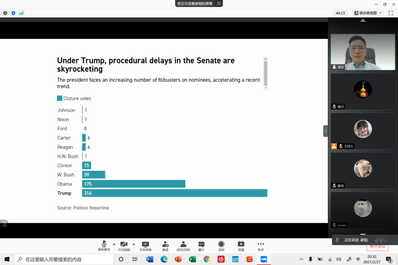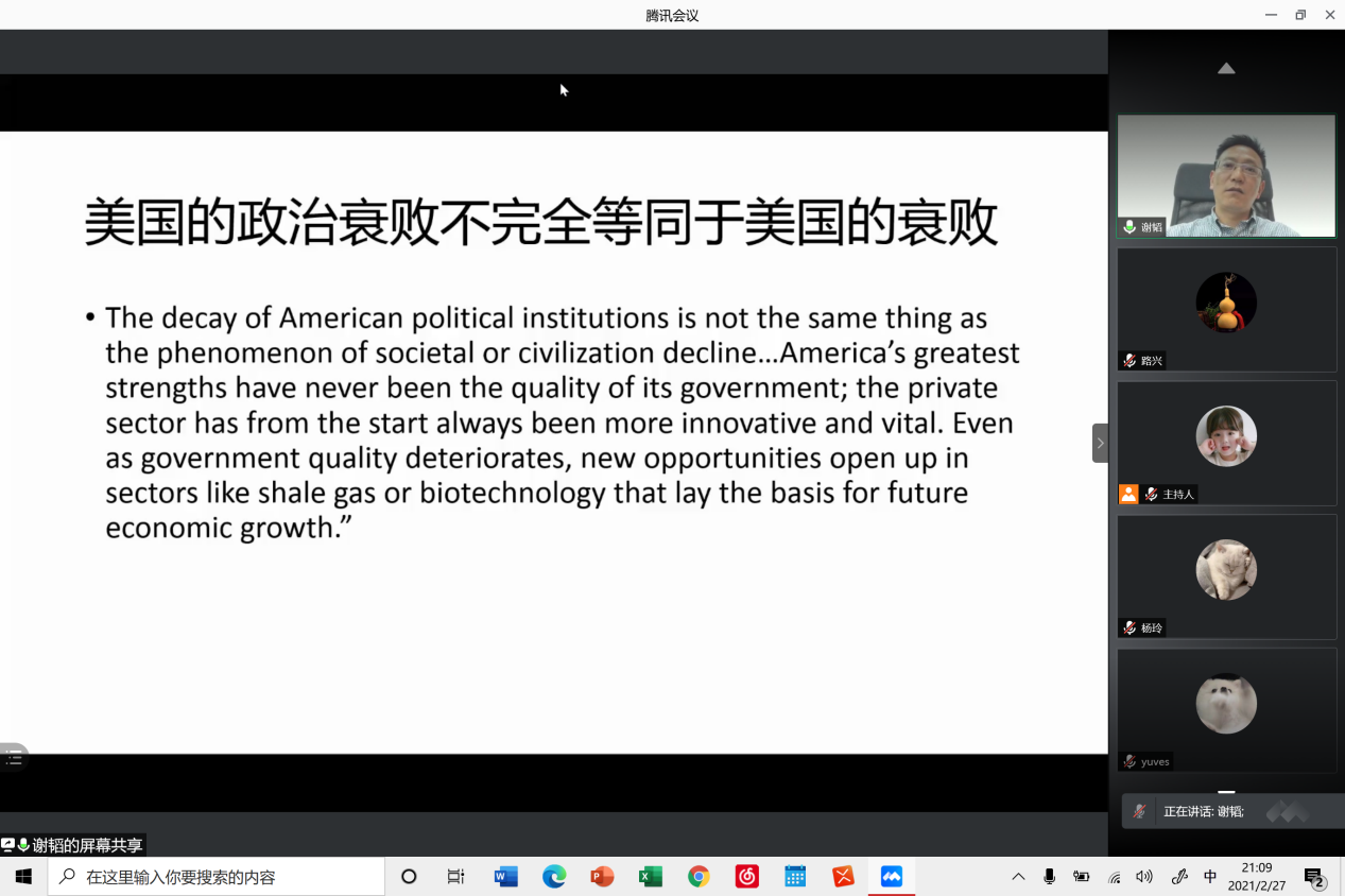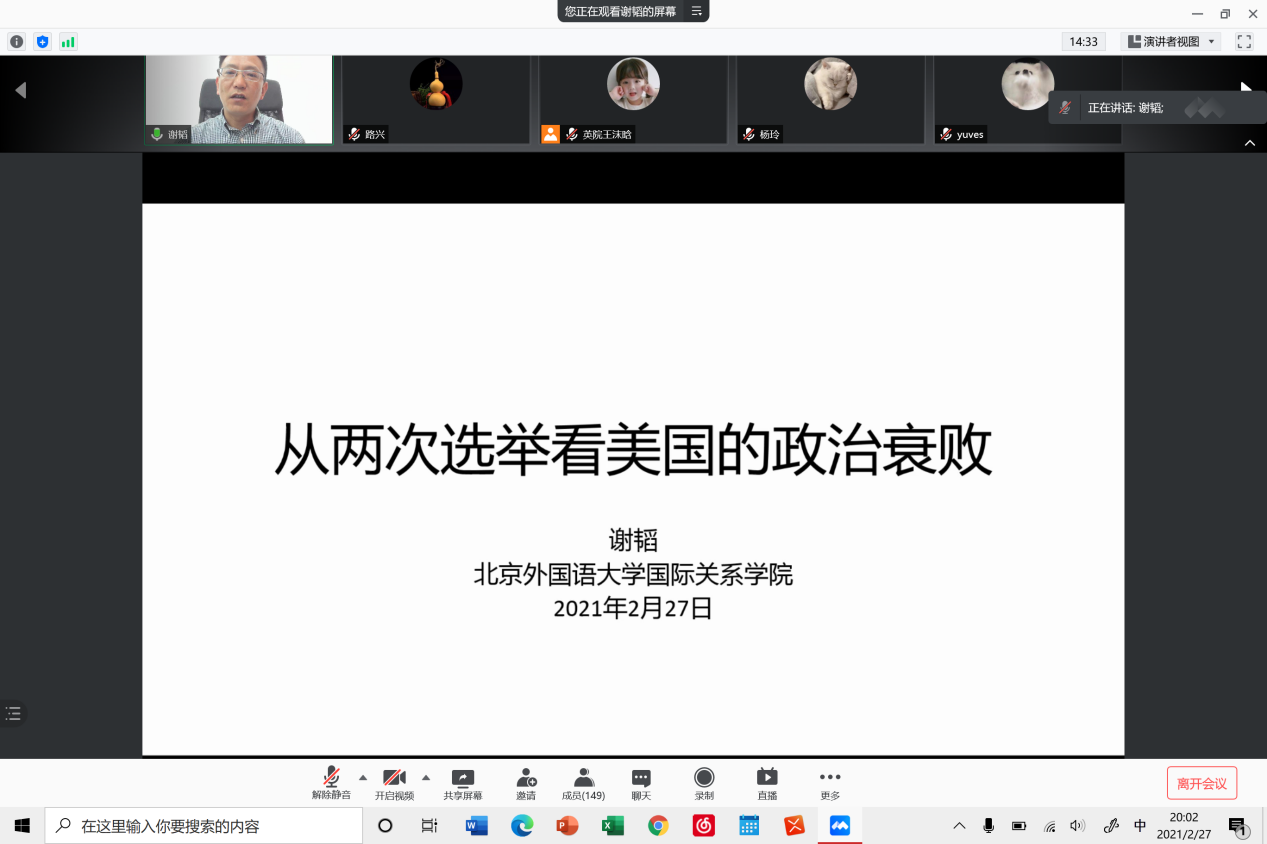 2021年2月27日晚,英语学院通过腾讯会议成功举办“从两次选举看美国的政治衰败”主题线上讲座。本次讲座邀请到我校国际关系学院院长、博士生导师谢韬教授为同学们剖析美国政治的形势与走向。