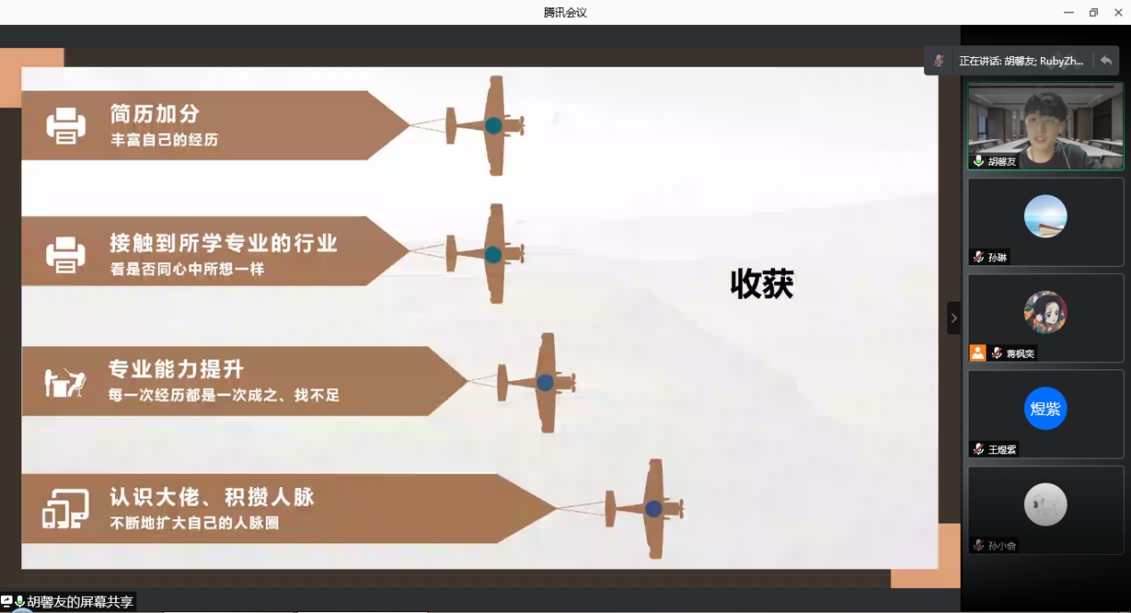 分享会第三部分由2015级胡馨友同志主讲。胡馨友同志在校期间曾担任英语学院本科生党支部书记,目前就职于策马翻译集团,担任中华口笔译大赛办公室主任,北外灯塔计划生涯成长导师。胡馨友同志从自己的工作经历出发,针对同学们在工作就业实习方面的问题进行了答疑与分享,鼓励学弟学妹们多尝试新事物,找到自己的方向,在大学四年里创造属于自己的精彩。