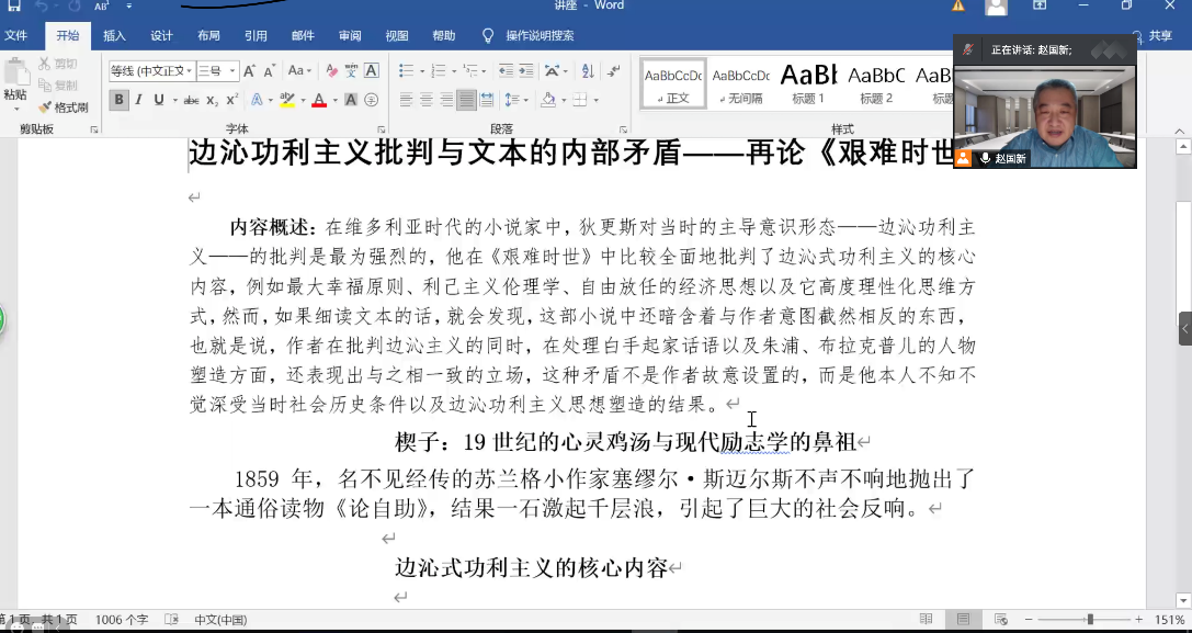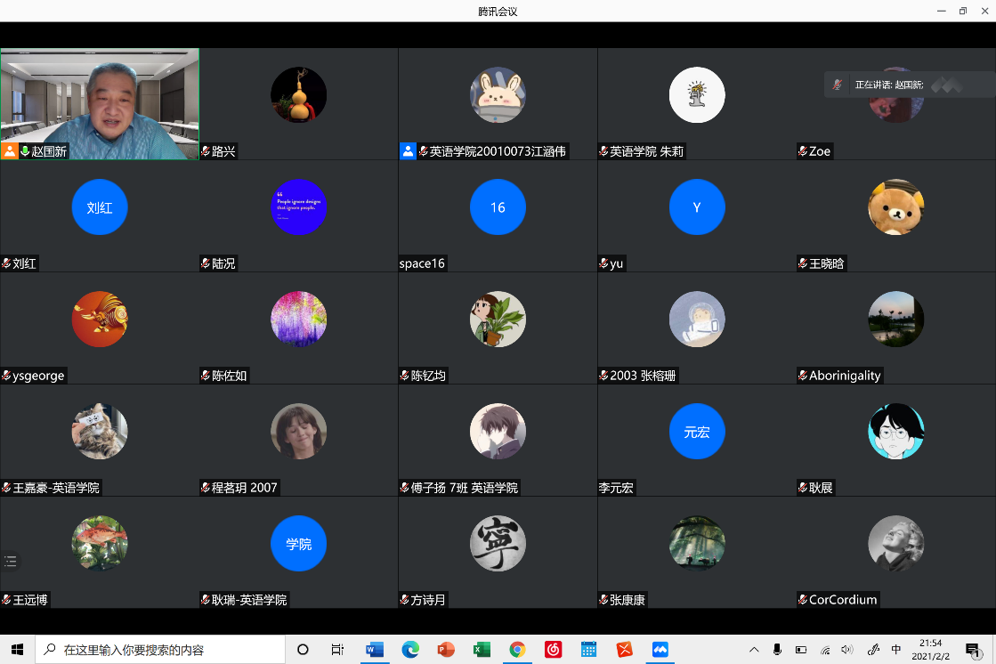 2021年2月2日晚,北京外国语大学英语学院“边沁功利主义批判与文本的内部矛盾——再论《艰难时世》”专题讲座如期举办。本次讲座邀请到英语学院赵国新教授为同学们分析文学作品中所体现的边沁功利主义及其内部矛盾,帮助同学们理解丰富的文学知识、提升文学素养。