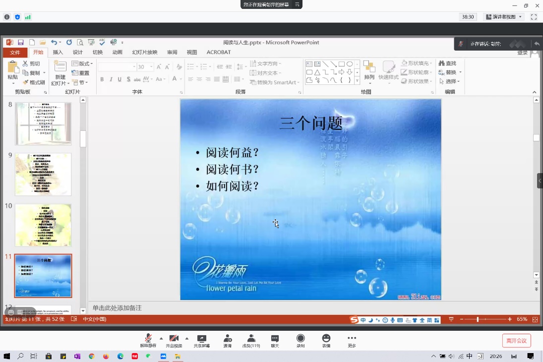 历经一个半小时后,英语学院“阅读与人生”专题讲座最终圆满落下帷幕。通过此次讲座,同学们切实感受到阅读的乐趣,同时也掌握了有效的阅读方法,对阅读与人生的关系有了进一步的思考。红日初升,其道大光。作为新时代的青年,同学们应胸怀理想,脚踏实地,笃志虚心,循序渐进,用书籍指明人生的方向,用书籍搭建梦想的阶梯。