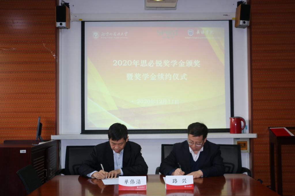 12月11日上午,英语学院举行2020年思必锐奖学金颁奖暨奖学金续约仪式。北京思必锐翻译有限公司总经理单伟清,国际合作部经理秦肖斌,资源部负责人王艺璐一行前来英语学院与师生座谈。党总支书记路兴,党总支副书记孟庆琨,辅导员于承杰以及2020年思必锐奖学金获奖学生参会。