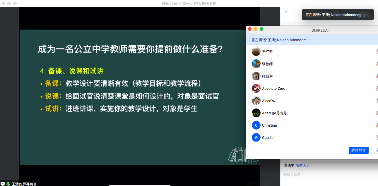 同学们也与学姐进行了在线的互动。参加活动的同学中,有许多已经参与过教师的面试,大家提出了许多关于面试中试讲课程的设计等问题。王清学姐根据自己的试讲经历和招聘经历,举了许多具体的例子,为同学们提供了具体而有效的建议。
