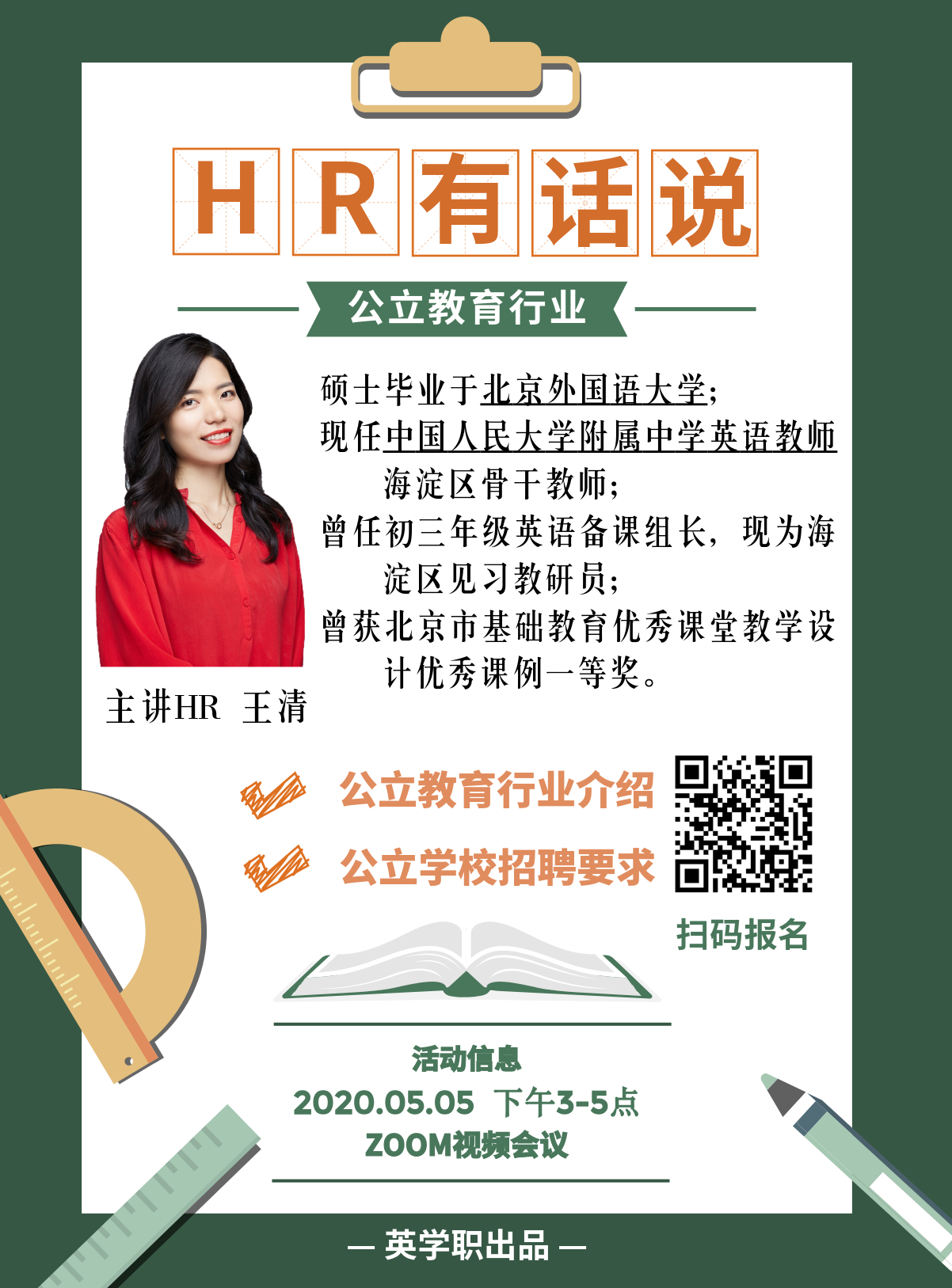 5月5日,我们邀请到了本科、硕士均毕业于北外英院,现任中国人民大学附属中学教师的王清学姐,担任“HR有话说”栏目第三期活动的主讲嘉宾。王清学姐在教育行业非常优秀,是海淀区骨干教师,曾任初三年级英语备课组长,现为海淀区见习教研员,曾获北京市基础教育优秀课堂教学设计优秀课例一等奖。