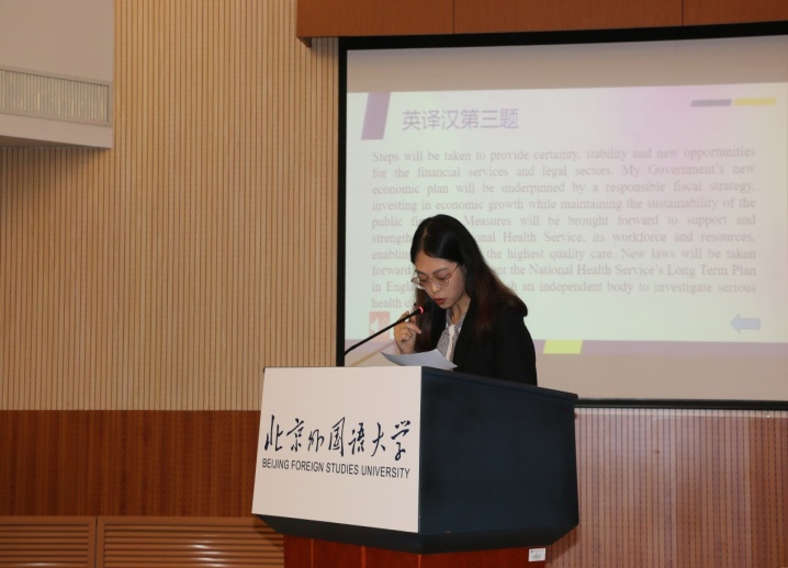 比赛伊始,北京外国语大学英语学院党总支书记、副院长路兴为大赛致辞。路兴老师指出翻译之精髓在于抓住目的语和源语的特点,译者需抽丝剥茧,精益求精,实现翻译沟通世界的作用。