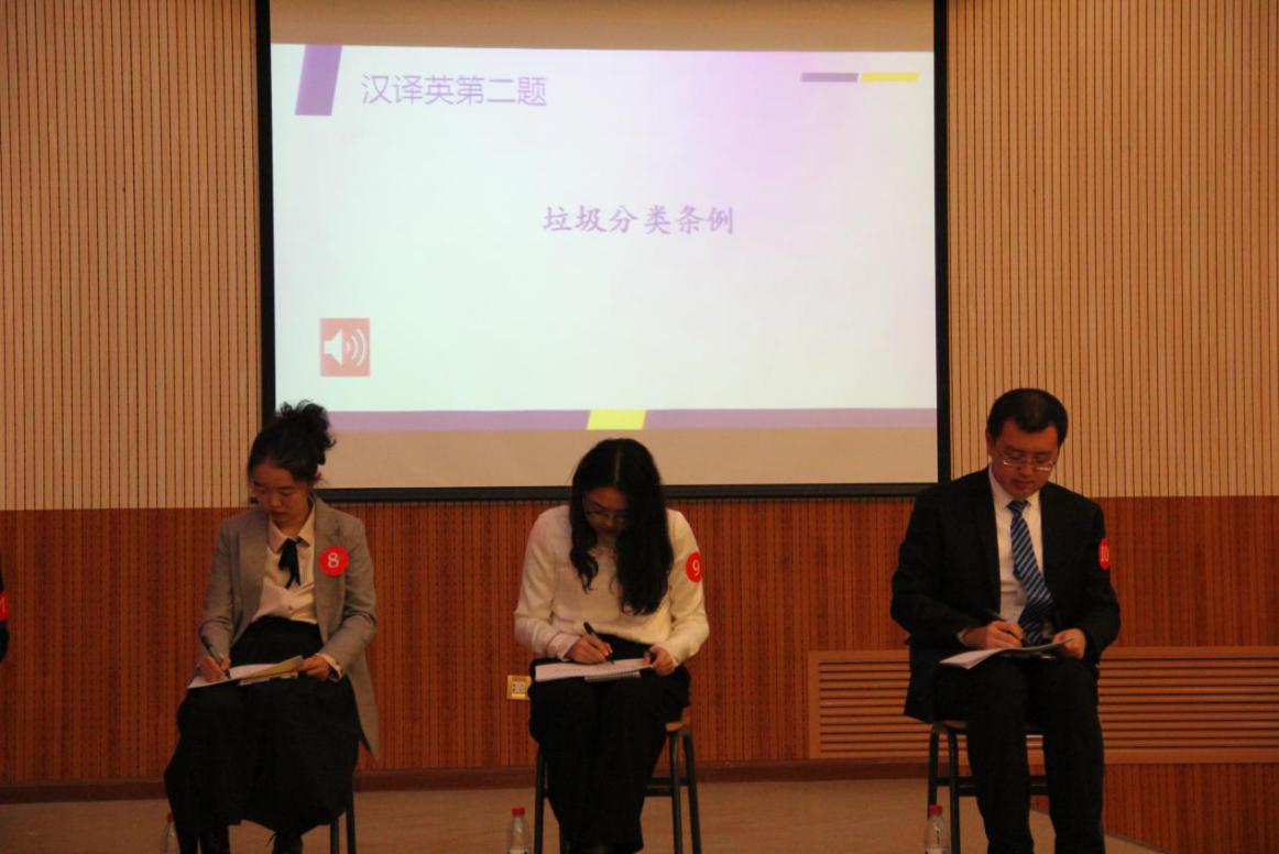 随后,比赛正式开始。三轮比赛高潮迭起。首轮热词翻译,旨在提高选手翻译意识,将翻译拓展到生活的方方面面;二轮新闻视译分为英译汉和汉译英两部分,旨在考察选手基本功;末轮现场交传为本次赛事的创新环节,中方和外方嘉宾就“技术帝国的崛起是否会威胁社会发展”这一辩题展开讨论,选手依次翻译。