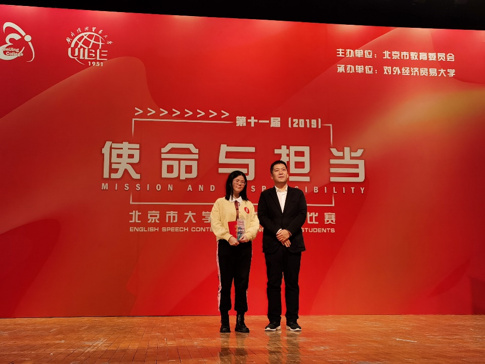 11月30日,由北京市教育委员会主办、对外经济贸易大学承办的第十一届(2019)北京市大学生英语演讲比赛圆满落幕,我校英语学院大一学生卢洁杀进决赛并荣获特等奖。本届大赛的主题是“使命与担当”,来自六十所北京高校的六十名选手同台竞技,以自己的演讲为媒介从不同角度阐释和传播新时代青年的“使命与担当”。我校选手卢洁复赛阶段尽管排位比较靠前不算太理想,但她仍以95.4分的高分位列小组第一出线进入了决赛。在决赛阶段,她沉着应战,凭借扎实的基本功和出色的发挥再次以94.21的高分拔得头筹,获得该项比赛特等奖。祝贺卢洁在此赛事中取得的优异成绩,同时也感谢英院指导老师周杜娟、龚雁老师以及英院演讲队成员们的辛勤付出。