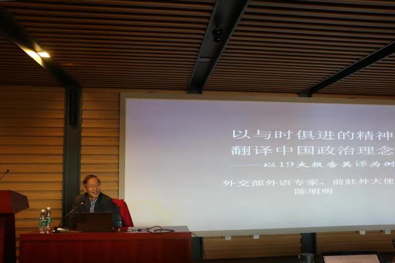 11月25日下午,外交部翻译室主任、资深外交官陈明明大使受邀来到我校,为师生作了题为“以与时俱进的精神翻译中国政治理念——以十九大报告翻译为例“的讲座。本次讲座由我校英语学院主办,由英语学院院长张剑教授主持。