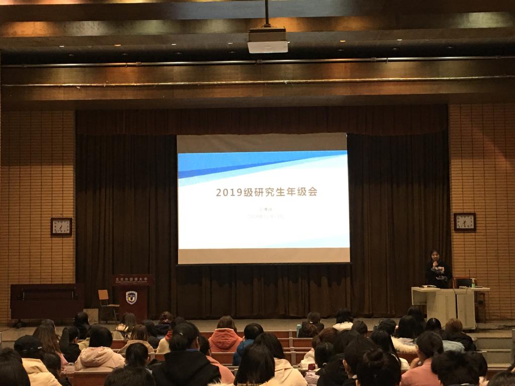 2019年11月13日晚,英语学院2019级研究生年级会在逸夫楼第三阶梯教室召开,党总支书记路兴、辅导员王博铮及2019级全体研究生出席参加。