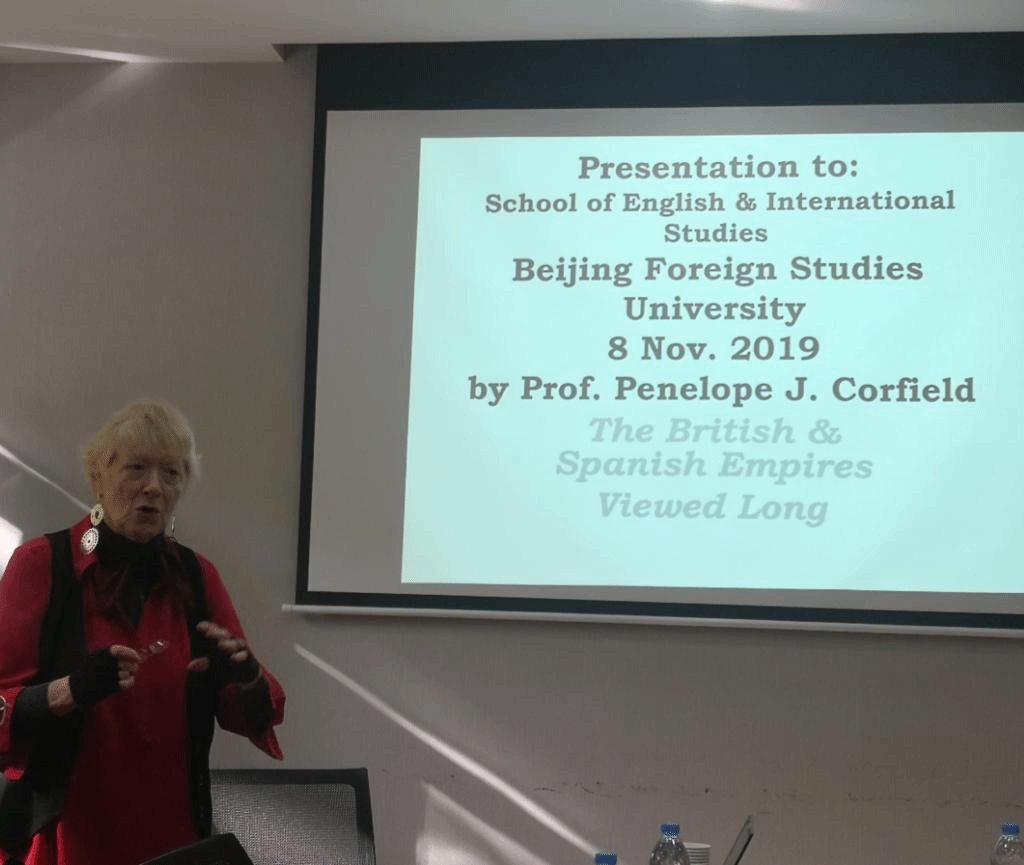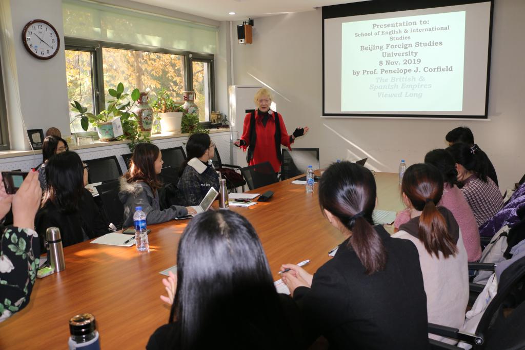2019年11月8日上午,英国18世纪研究会主席、国际18世纪研究会副主席、伦敦大学皇家霍洛威学院教授Penelope Corfield女士访问英语学院英国研究中心、爱尔兰研究中心并以 “西班牙帝国和大英帝国兴衰的长时段历史考察”为题面向英语学院师生做了学术讲座。英语学院副院长、英国研究中心、爱尔兰研究中心主任王展鹏主持讲座并就有关合作进行了讨论。