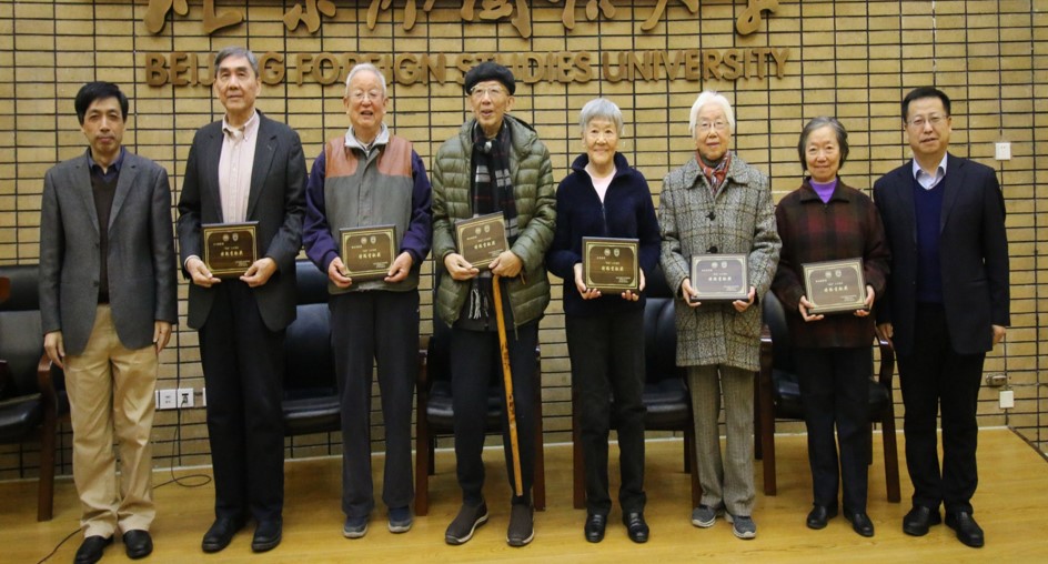 庆典在美研中心硕士生合唱的“故乡的亲人”的优美曲调中拉开序幕,美国研究中心主任付美榕教授主持了开幕式。北京外国语大学副校长孙有中教授通过视频首先致辞。他充分肯定了美国研究中心四十来在学科建设与人才培养方面取得的长足进步,同时激励美研中心抓住新的发展机遇,努力进取、再创辉煌。英语学院院长张剑教授代表英语学院致辞。他向不同时期担任美国研究中心主任的邓炎昌教授、朱永涛教授、梅仁毅教授,以及和他们同舟共济的杨立民教授、吴青教授、林克美教授、张毓霖教授、陆培敏教授、吴冰教授、王立礼教授等诸位前辈表示深深的敬意,并向曾经在美国研究中心任教的Helen Young教授,、John Blair教授、王心扬教授、金莉教授等30多位外籍专家、富布莱特学者、客座教授和兼职教授表示诚挚的谢意。张剑院长还强调指出,随着中国“一带一路”战略的展开,区域与国别研究受到高度重视,外语学科框架下区域国别研究人才的培养得到众多高校的青睐,也面临诸多挑战。他衷心希望,美国研究中心能够在付美榕教授的带领下秉承传统、继续开拓,为英语学院的国别研究人才培养、学术研究、对外交流做出更大的成绩。开幕式的另一项内容是颁奖礼。英语学院路兴书记和张剑院长为美国研究中心荣休教授--邓炎昌、朱永涛、梅仁毅、杨立民、吴青、林克美、张毓霖、陆培敏教授以及客座教授王心扬教授颁发了“美国研究中心人才培养特殊贡献奖”奖牌,同时为中美教育基金(US-China Education Trust)主席张之香(Julia Chang Bloch)女士颁发了“美国研究中心发展特殊贡献奖” 奖牌。颁奖礼上还播放了美国研究中心创始人、96岁的邓炎昌教授从美国亚利桑那州发来的问候,以及1980年代至1990年代初在美国研究中心任教的美国教授Helen Young 女士的寄语。