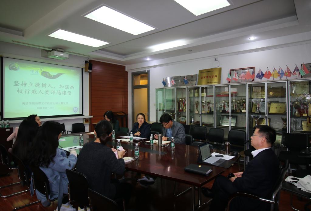 2019年10月17日下午,英语学院教职工行政党支部在英语楼115会议室召开“坚持立德树人,加强高校行政人员师德建设”教育学习活动。